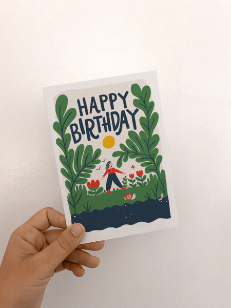 A beautifully illustrated birthday card featuring a cheerful illustration of a lovely garden stroll.