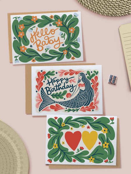 A beautifully illustrated new baby card, featuring a folky, pastel wreath design full of joyful celebration.