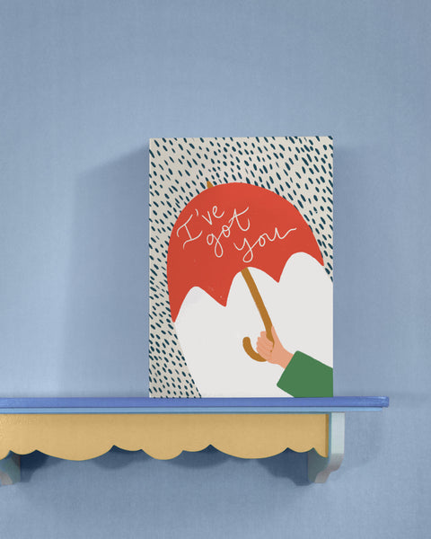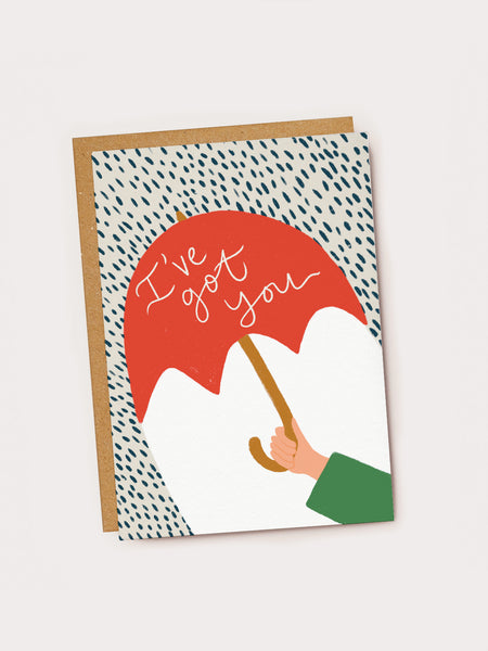 A beautifully illustrated card with a supportive umbrella illustration, for sending love on rainy days.