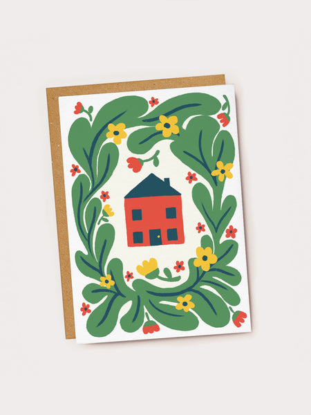 A beautifully illustrated floral, folky card with a little red house, to send sweet housewarming love and celebrations.