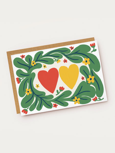 A beautifully illustrated floral, folky card with two colourful hearts, perfect for sending on Valentine's or for weddings and anniversaries.