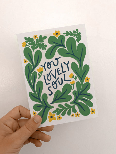 A beautifully illustrated card with a plant wreath and hand lettered message 'You Lovely Soul,' for sending love and thanks.